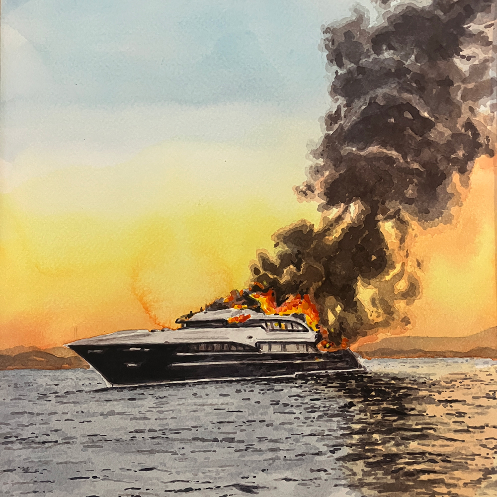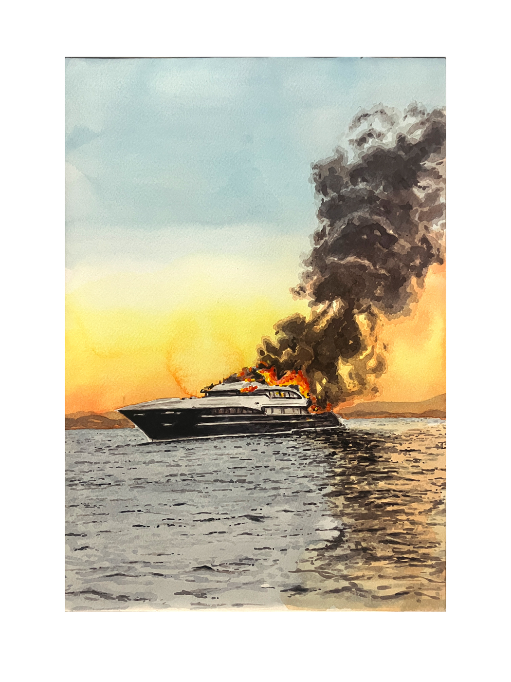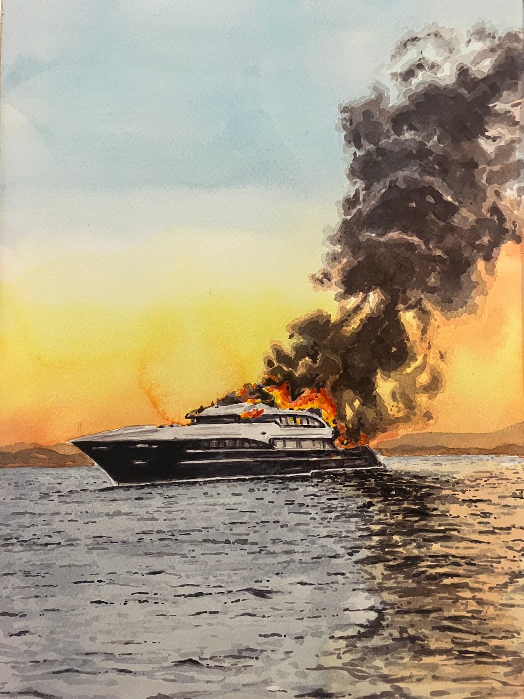 There is a stange poetry in a Superyach burning quietly at sea. “Atina”, 10 August 2024